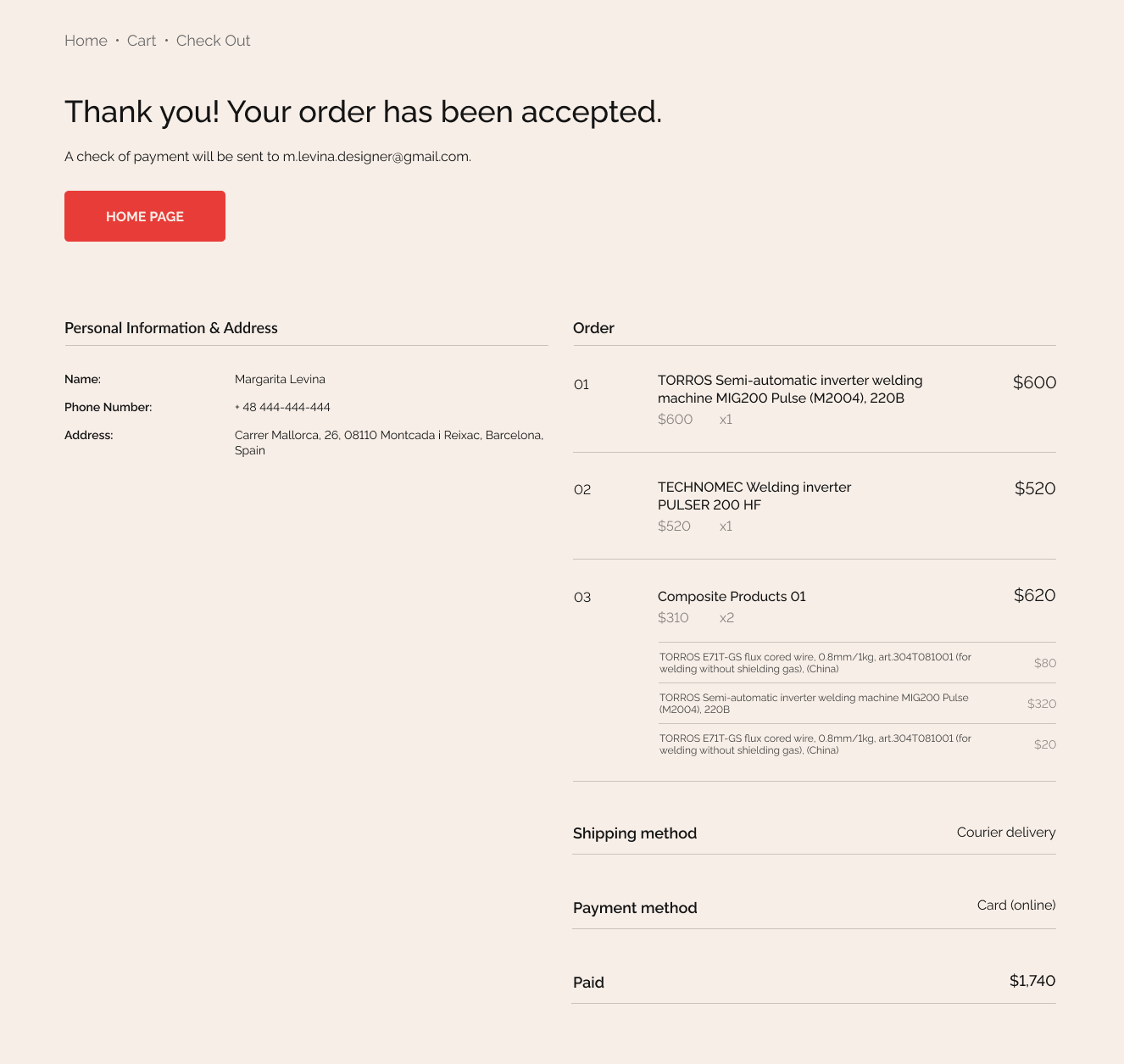 Checkout page where you can see all the info about the order