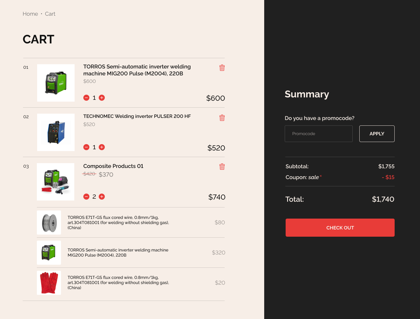 Cart page where you can see a list of products and a summary in minimalistic design